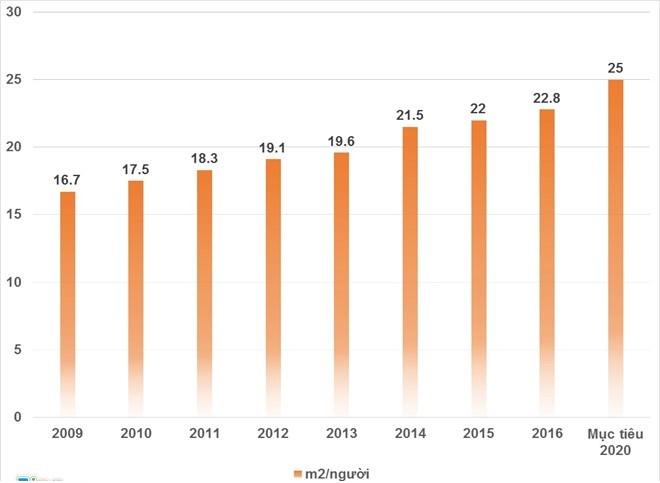 Theo báo cáo của Bộ Xây dựng, tính đến hết tháng 12/2016, diện tích bình quân nhà ở toàn quốc đạt khoảng 22,8m2 sàn/người, so với năm 2015 tăng 0,8m2 sàn/người.