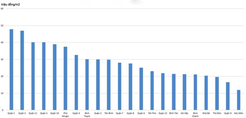 Theo Data First, căn hộ rao bán trên thị trường Tp.HCM trong 9 tháng qua có mức giá trung bình 29 triệu đồng/m2. Trong đó, mức giá ở quận 1 cao nhất ở ngưỡng 47,8 triệu đồng và thấp nhất thuộc về huyện Hóc Môn 12 triệu đồng/m2.