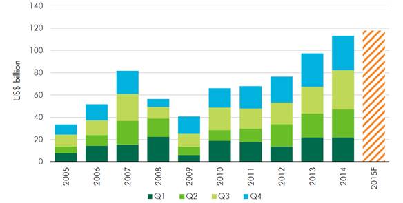 Vừa qua, CBRE đã công bố báo cáo Triển vọng thị trường bất động sản châu Á – Thái Bình Dương trong năm 2015. Trong báo cáo, CBRE dự kiến trong năm 2015 tăng trưởng giá cho thuê và giá trị vốn vào mức khoảng 2-4% cho phân khúc văn phòng, bán lẻ và các ngành công nghiệp.
